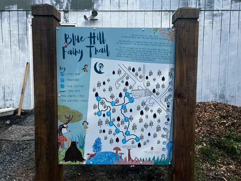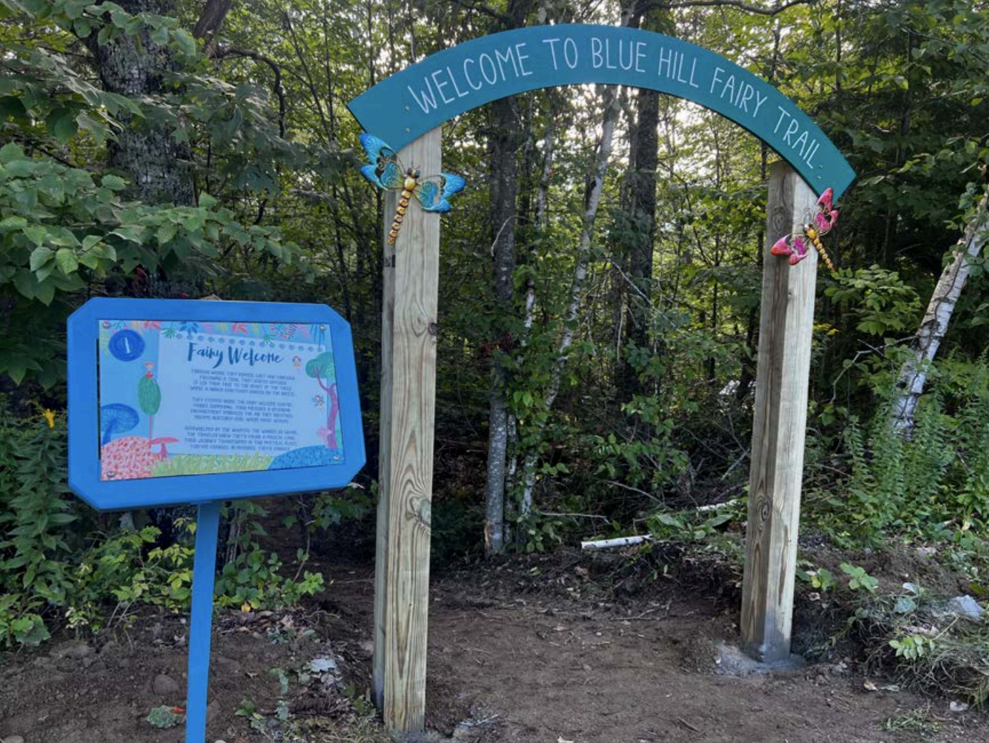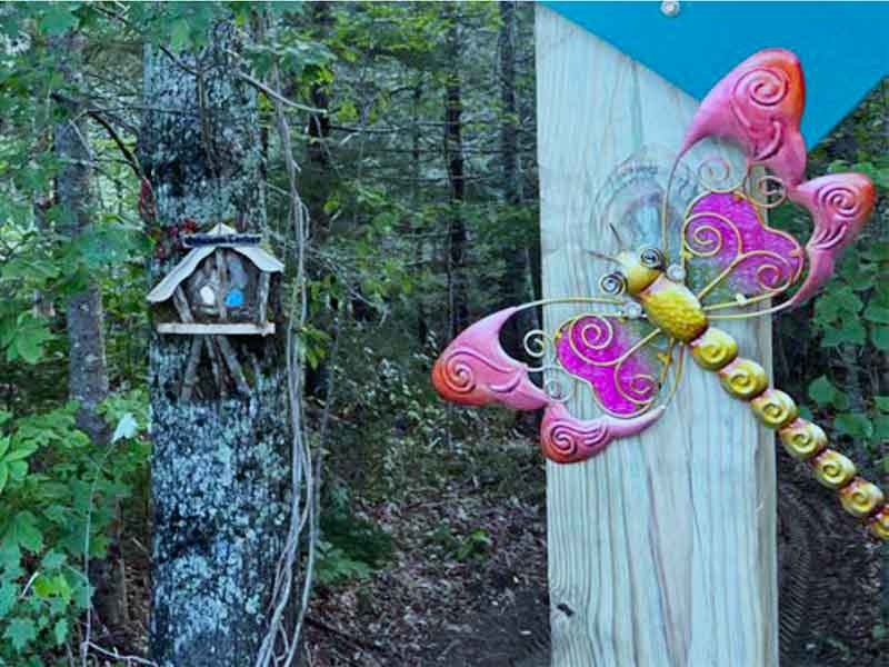 Custom wooden archway, welcoming you to the fairy trail. Marker panel & post with some small fairy houses as you go through the arch.